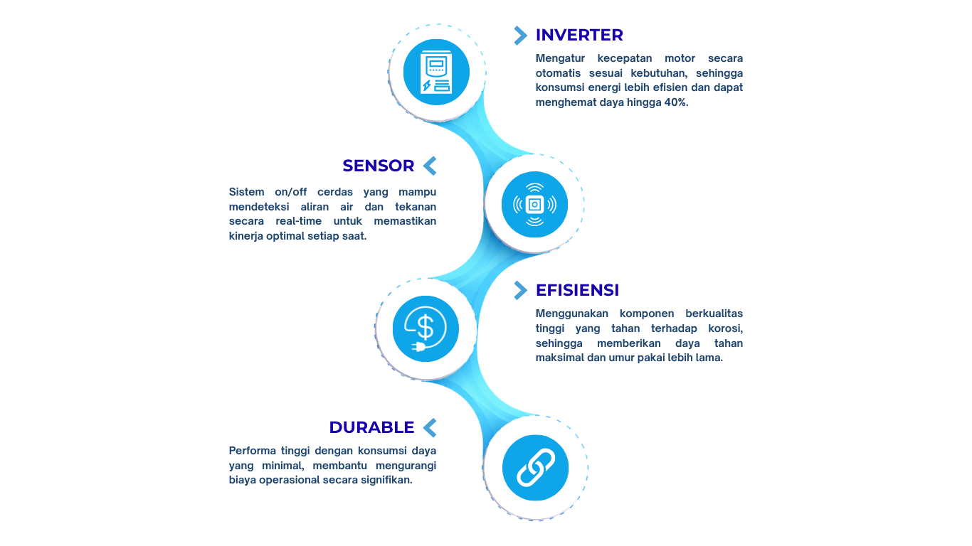 Pompa Maxon dilengkapi teknologi inverter modern yangbekerja otomatis sesuai kebutuhan air di rumah Anda. Lebih hemat listrik hingga 40%, Suara lebih halus & tidak berisik, Umur pompa lebih panjang & minim perawatan.